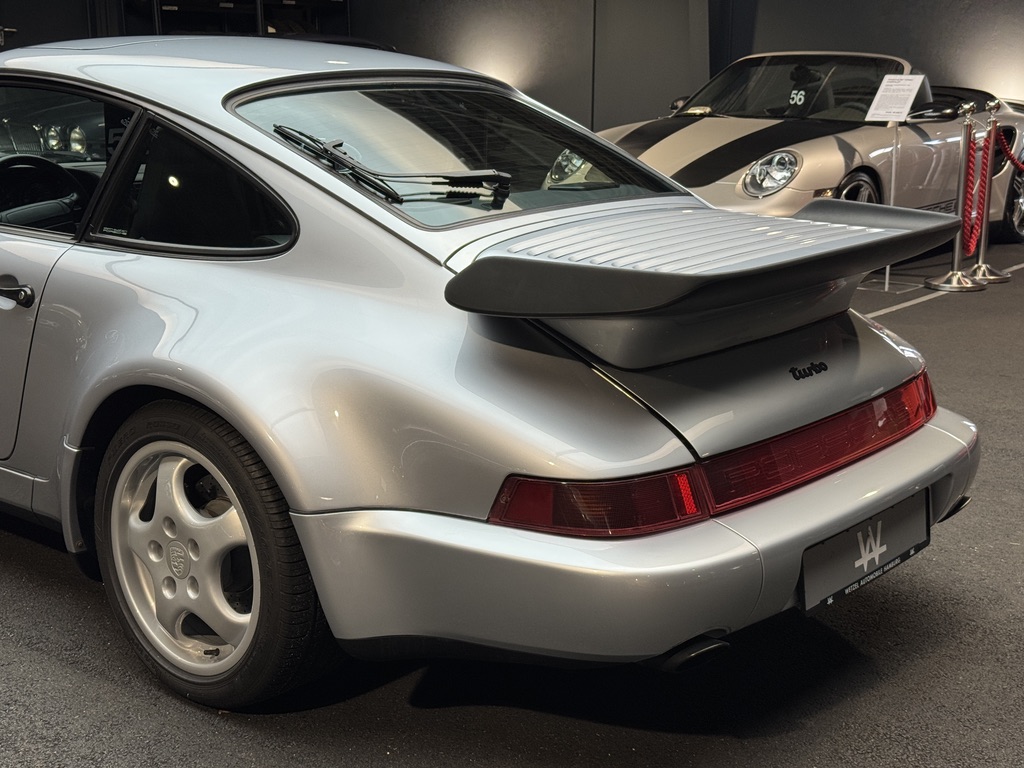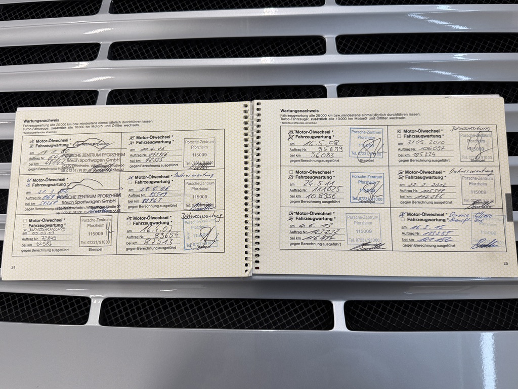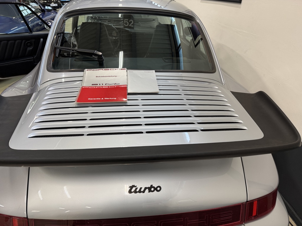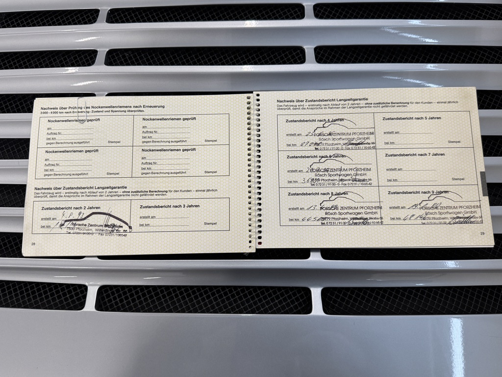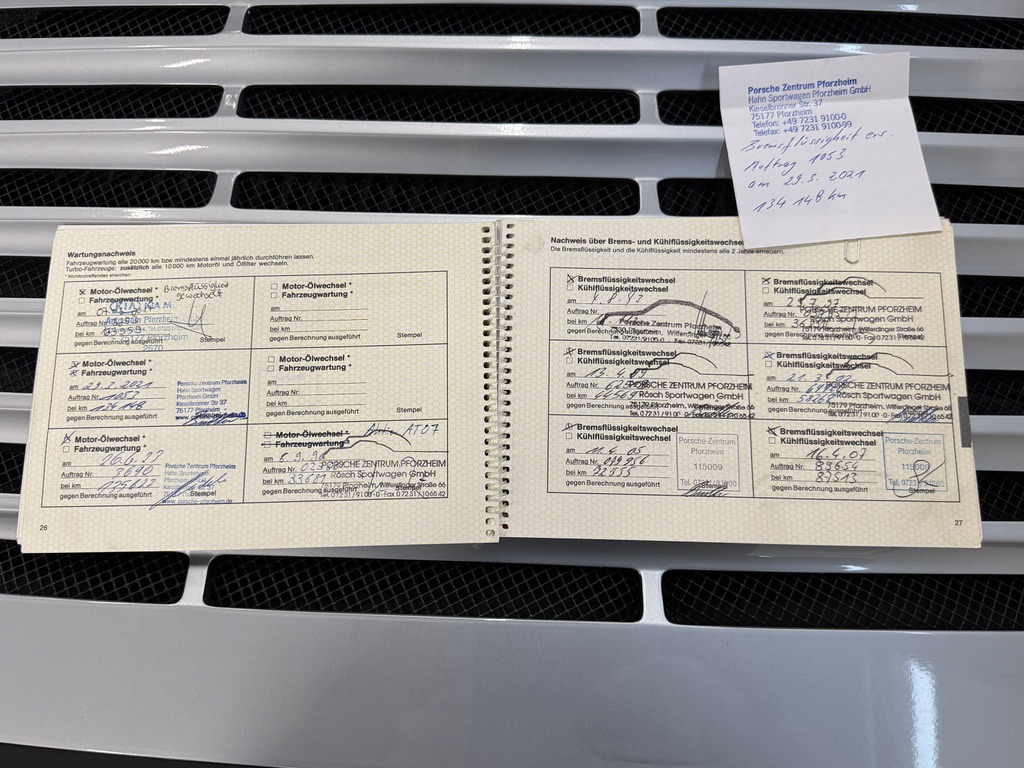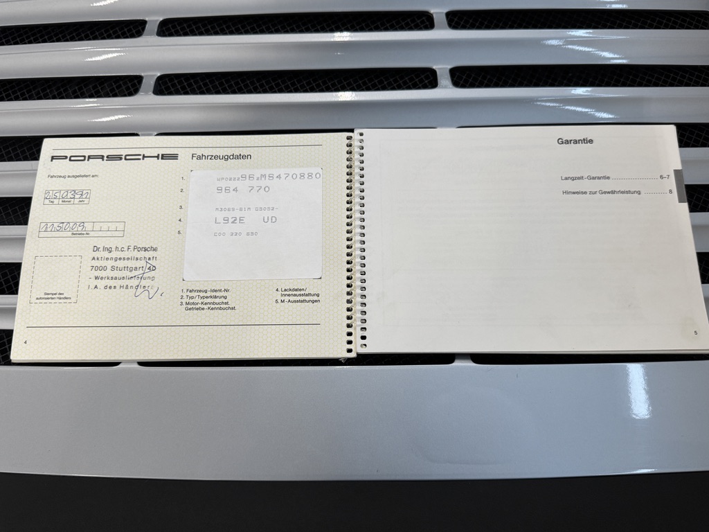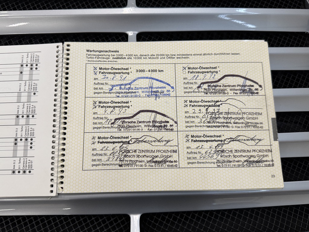Dieser Turbo in sehr stimmiger Farbkombination wurde im PZ Pforzheim an seinen einzigen Halter (Jahrgang 1936) ausgeliefert. Das Scheckheft wurde lückenlos im PZ Pforzheim bis auf einen Eintrag geführt. Dieser stammte damals von einer befreundeten Werkstatt. Die Rechnungshistorie der PZ-Rechnungen belegen Wartungen in Höhe von 20t€. Der jetzige Besitzer hat den Wagen von den Erben übernommen und vor Überführung auf Achse einen Check samt Ölwechsel vom PZ Pforzheim durchführen lassen. Hier in Hamburg gab es gerade einen sehr umfangreichen Service inkl. Überholung Kettenkästen bei David Sportscards für 15t€. Die aufgezogenen Reifen sind aus 2019 mit einer Laufleistung von lediglich 3.000km. Neben der Historie ist die Bordmappe erhalten sowie ein originaler Satz Zweitschlüssel, der augenscheinlich nie benutzt wurde. Die Schlüsselkarte mit Radiocode ist ebenso vorhanden und wirkt, als ob Sie zu einem Neuwagen gehören würde. Dieser 964 Turbo ist aufgrund seiner stimmigen Farbkombination, seiner ausgezeichneten Historie, seinem tadellosen Aussehen sowie dem technisch gut gewarteten Zustand sowohl ein Garant für perfekten 964-Königsklassen-Fahrspass als auch eine echte Investitionsanlage. Wenn Sie auf der Suche nach einem Porsche 911 Turbo sind, schauen Sie sich diesen 964 gern einmal an. Er steht in Hamburg in meiner Halle zur Besichtigung und bei schönem Wetter zur Probefahrt nach Terminvereinbarung zur Verfügung. Ich freue mich auf Ihren Besuch.