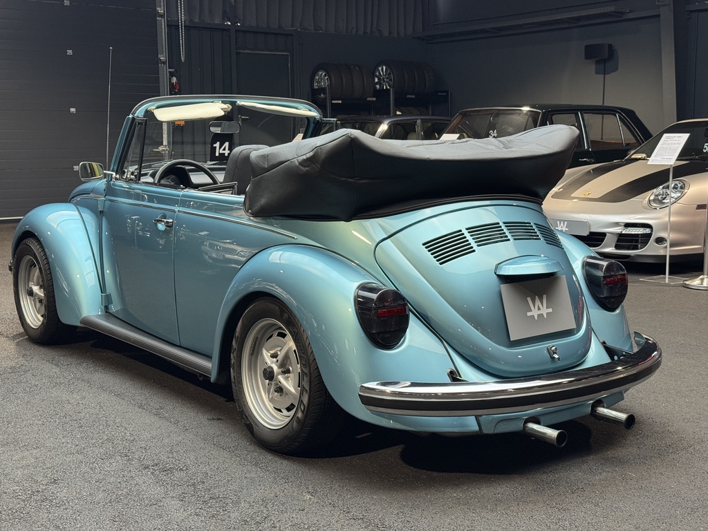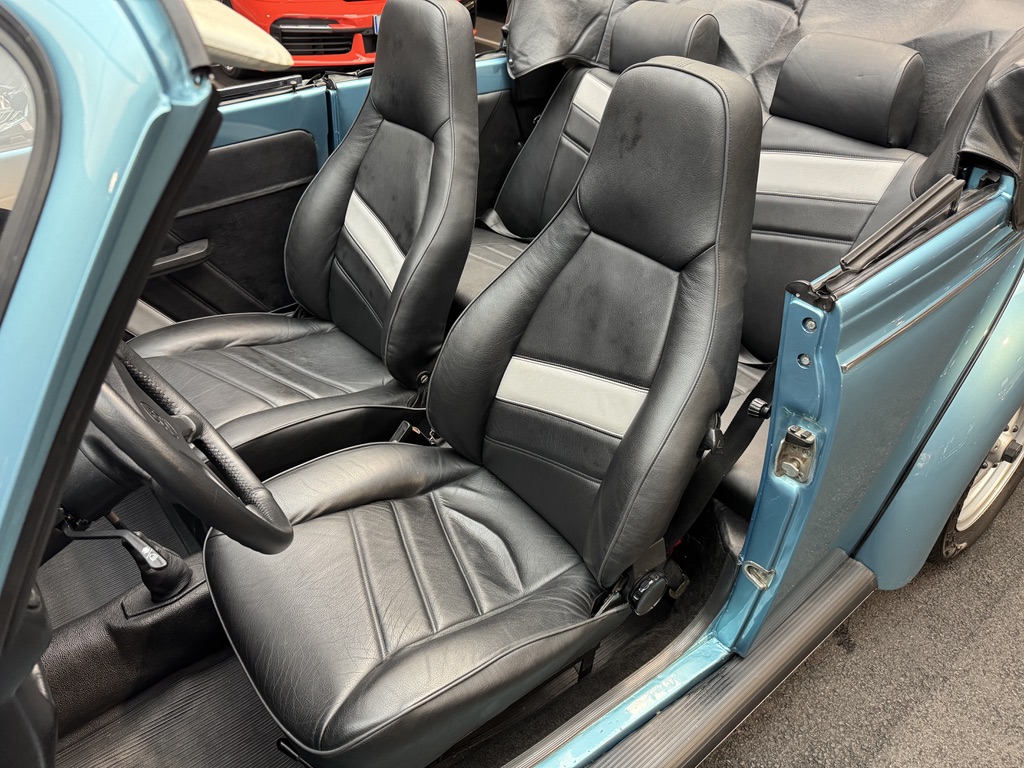 Dieses wunderschöne Cabriolet ist eine deutsche Auslieferung und im originalen Farbton Riverblau-Metallic lackiert. Nur 1.000 wurden in dieser Farbe ausgeliefert. Seit 1999 war es im letzten Besitz. In den ganzen 26 Jahren wurden nur 8.300 km damit gefahren und es wurde immer in der Garage aufgehoben. Die Halterhistorie ist seit 1988 belegt. Es wurde einiges in den Zustand investiert und auch verbessert. So glänzt der Wagen mit einem Gewindefahrwerk, breiten Stahlfelgen (zusammen mit dem Ersatzrad gepulvert), Edelstahltrittbrettern, Edelstahl-Auspuff, dunklen Rückleuchten, Porsche Sitzen, einem bezogenen Lenkrad und einer Sitzbank mit drei Hüftgurten und Kopfstützen. Das Verdeck wurde 1997 erneuert. Der Kofferraum wurde mit Teppich gedämmt.